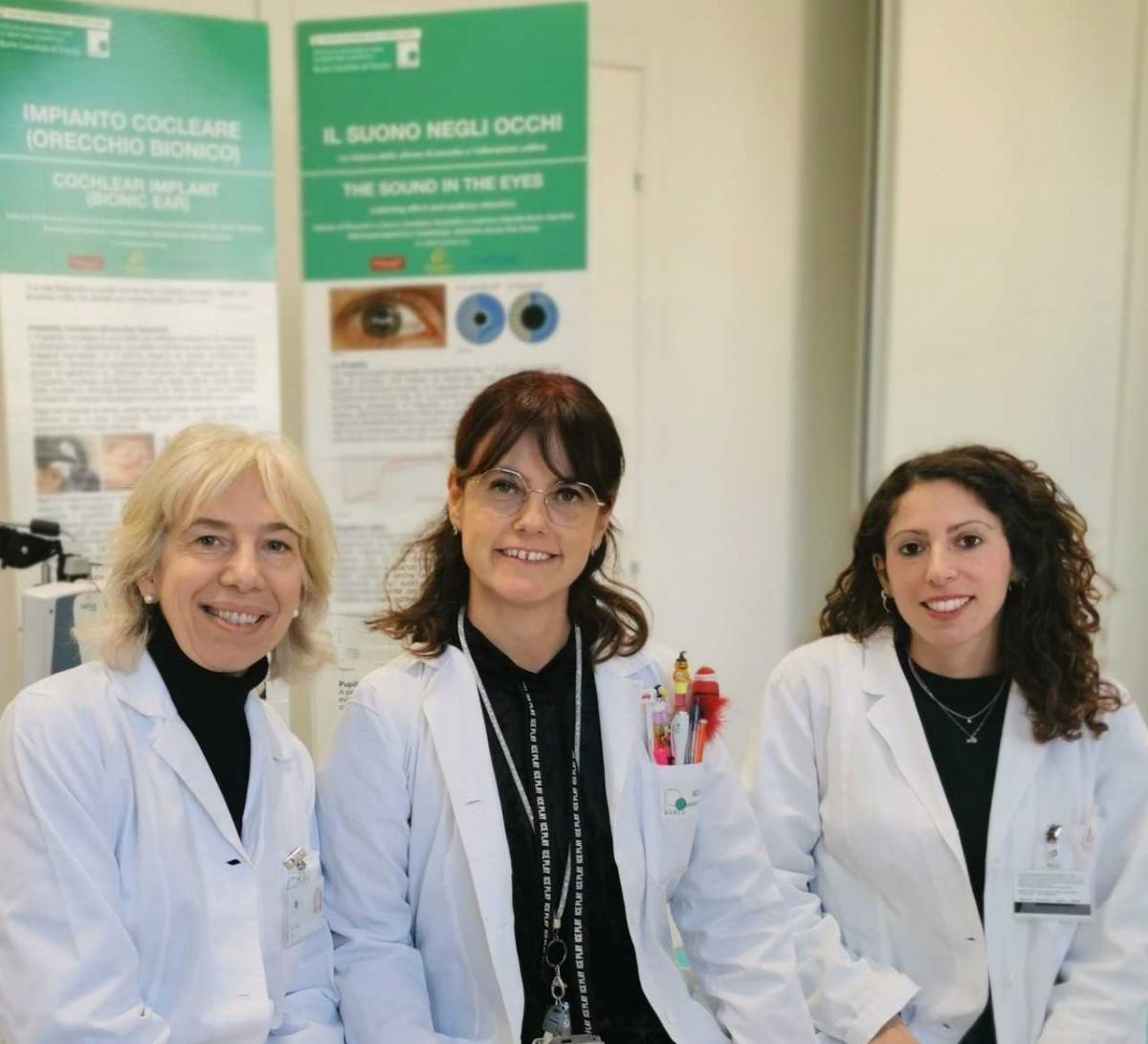 Nelle foto, da sinistra, le dottoresse Eva Orzan, Paola Michieletto e Marta Fantoni e un impianto cocleare pediatrico realizzato nella struttura.